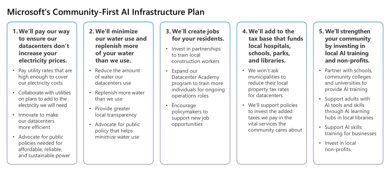 Компания объявила о запуске новой инициативы «Инфраструктура ИИ в интересах общества» (Community-First AI Infrastructure), которая представляет собой план из пяти пунктов. В него входят обязательства платить по более высоким тарифам, чтобы предотвратить рост счетов за электричество для других потребителей, минимизировать потребление воды, обучать сотрудников и создавать рабочие места, а также вносить вклад в местную налоговую базу в местах присутствия.