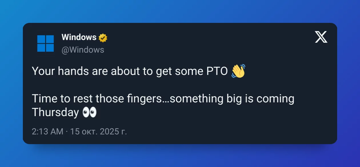 Microsoft сообщила, что уже завтра, 16 октября 2025 года, сделает некий «большой анонс», связанный с операционной системой Windows. В своём посте в X* (бывший Twitter) компания намекнула на грядущие изменения в способах взаимодействия пользователей с компьютерами. Дополнительных подробностей пока нет.