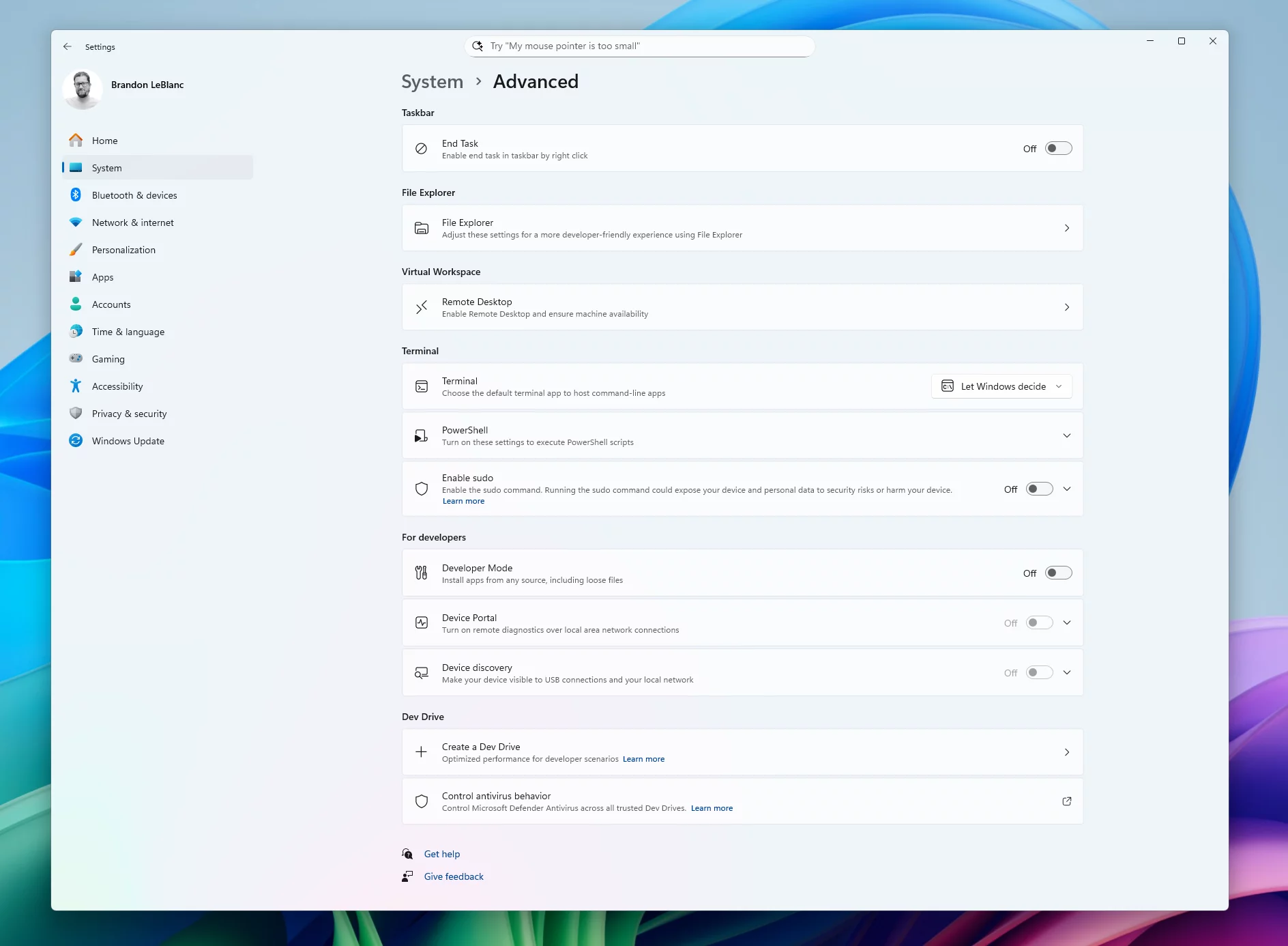 Переработанная страница «Дополнительные параметры» («Параметры» → «Система» → «Дополнительные параметры») является обновлением страницы «Для разработчиков». Среди настроек можно найти «Проводник + контроль версий», который отображает детали Git, такие как ветка, количество изменений и сообщение о последнем коммите, прямо в «Проводнике» при выборе папки репозитория.