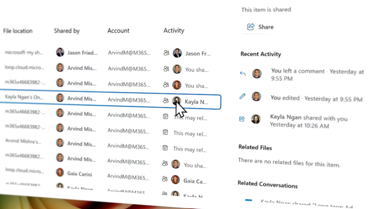 Для корпоративных клиентов, вошедших в систему с помощью рабочей или учебной учетной записи (Entra ID), «Проводник» будет отображать значки людей в столбце «Активность» и в разделе «Рекомендованные» в верхней части «Домашней страницы Проводника». Наведите курсор на значок человека или нажмите на него, чтобы открыть карточку Microsoft 365 Live Persona, которая покажет, кто этот человек и как он связан с файлом.