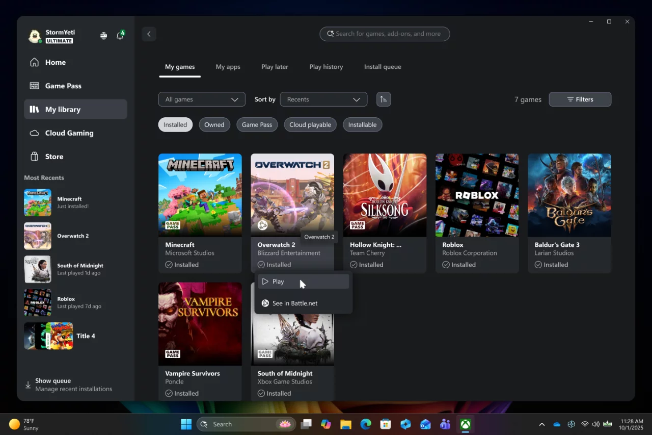 В приложении Xbox для ПК теперь вы можете легко получить доступ к своей игровой библиотеке, приложениям и истории игр в одном месте с Xbox на ПК и портативных устройств под управлением Windows.