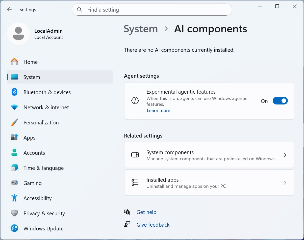 В приложении «Параметры» в разделе «Система» → «Компоненты ИИ» добавлен новый переключатель «Экспериментальные агентные функции». Эта настройка позволяет агентам использовать новые агентные возможности Windows. Подробности по этой ссылке.