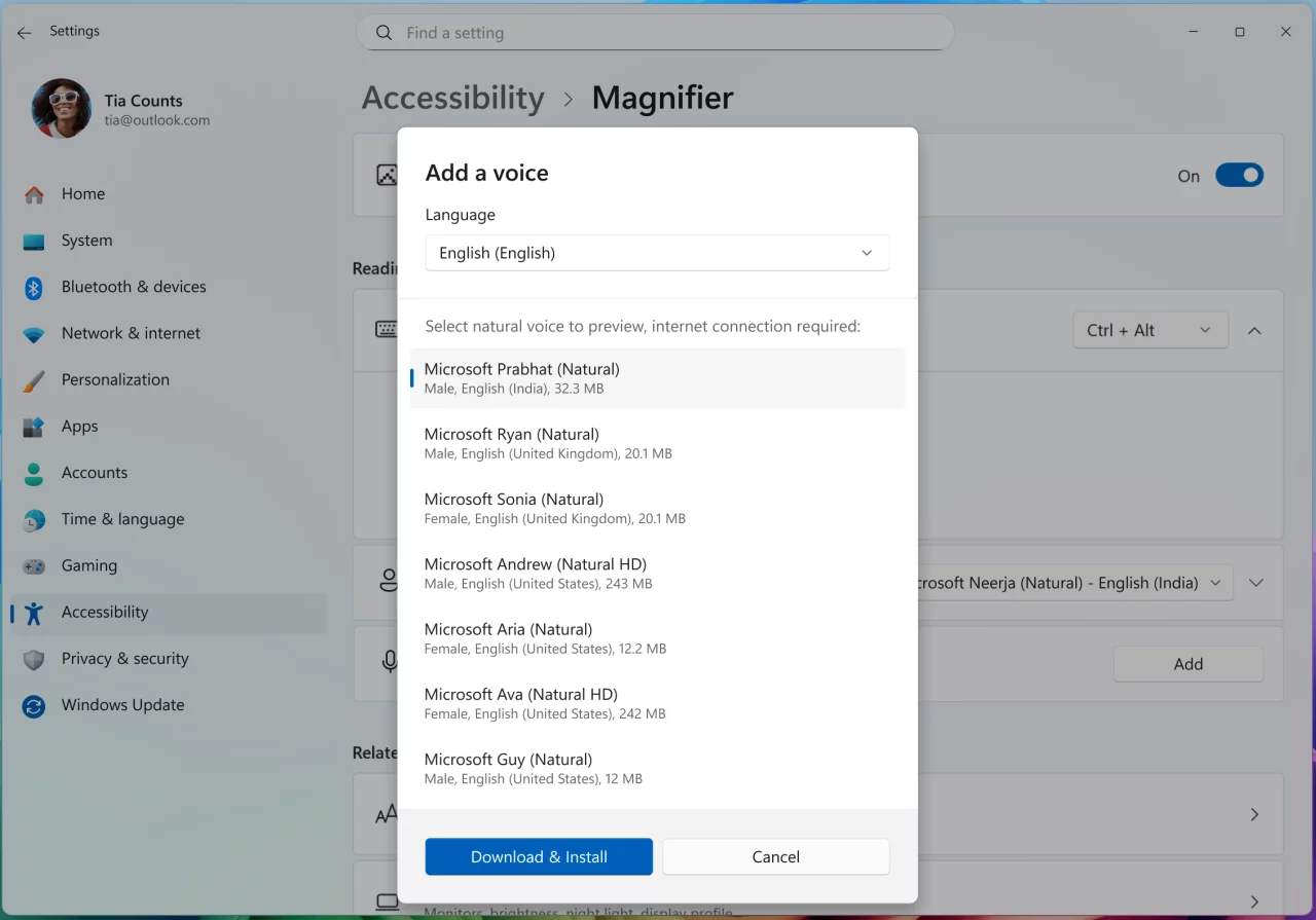 «Экранный диктор» и «Экранная лупа» теперь поддерживают HD-голоса для английского языка (США) на базе новейших локальных моделей преобразования текста в речь от Azure. Эти голоса используют генеративный ИИ для подстройки тона и темпа, что делает речь более естественной и выразительной.