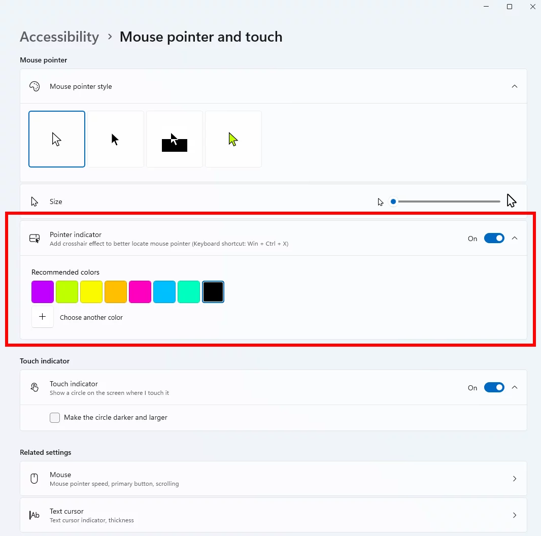 Чтобы включить эту функцию, перейдите в «Параметры» → «Специальные возможности» → «Указатель мыши и сенсорный ввод» и активируйте индикатор курсора. Также найти опцию вы можете с помощью поиска Windows. Когда функция включена, вы сможете включать и отключать её с помощью сочетания клавиш Win + Ctrl + X.