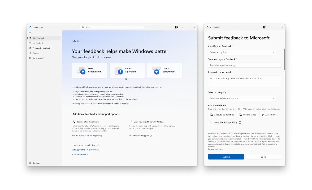 - Улучшенный «Центр отзывов» (Feedback Hub). Microsoft выпустила крупнейшее обновление «Центра отзывов» с переработанным интерфейсом, который делает отправку обратной связи и общение с сообществом быстрее и удобнее.