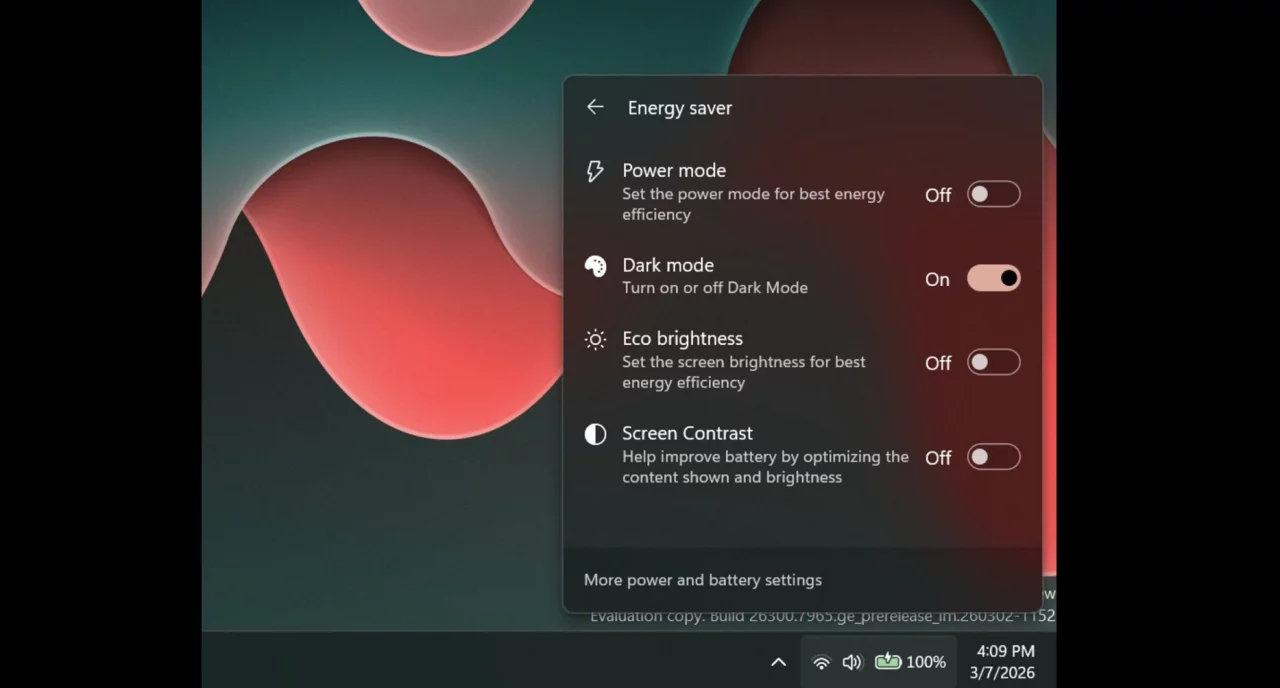 Кроме этого, в инсайдерских сборках Windows 11 замечено несколько довольно интересных новшеств. Например, в меню «Быстрых настроек» появится новая страница «Энергосбережение», которая позволит быстро включать и отключать тёмную тему оформления в операционной системе. Там же расположатся переключатели эко-яркости, контрастности экрана и выбор режима питания.