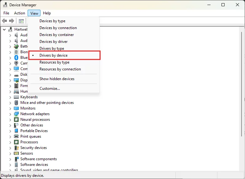 Откройте «Диспетчер устройств» и в меню «Вид» выберите «Драйверы по устройствам».