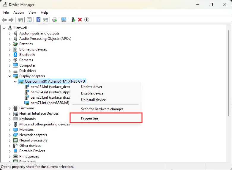 В разделе «Видеоадаптеры» нажмите правой кнопкой мыши на Qualcomm® Adreno™ X1-85 GPU и выберите «Свойства».