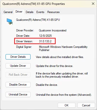 Путь для проверки версии: «Диспетчер устройств» → «Видеоадаптеры» → правой кнопкой мыши на Qualcomm® Adreno™ X1-85 GPU → «Свойства» → вкладка «Драйвер».