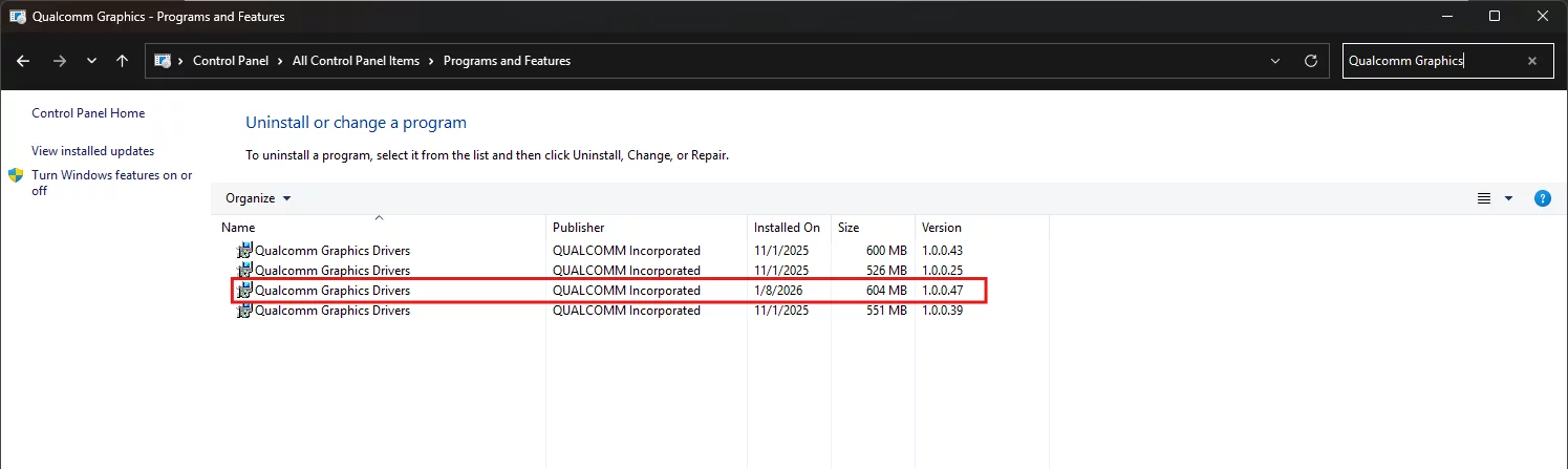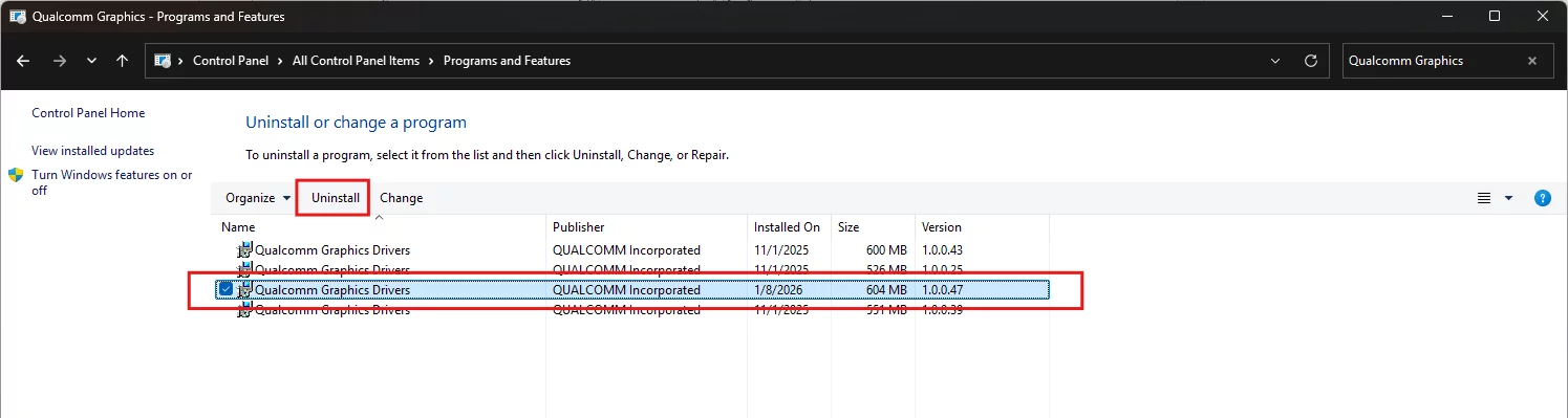 Чтобы выполнить откат и удаление данного драйвера, откройте «Панель управления» → «Программы и компоненты», выберите Qualcomm Graphics Drivers нужной версии и нажмите «Удалить». Драйвер будет возвращен к стандартной версии от OEM-производителя.