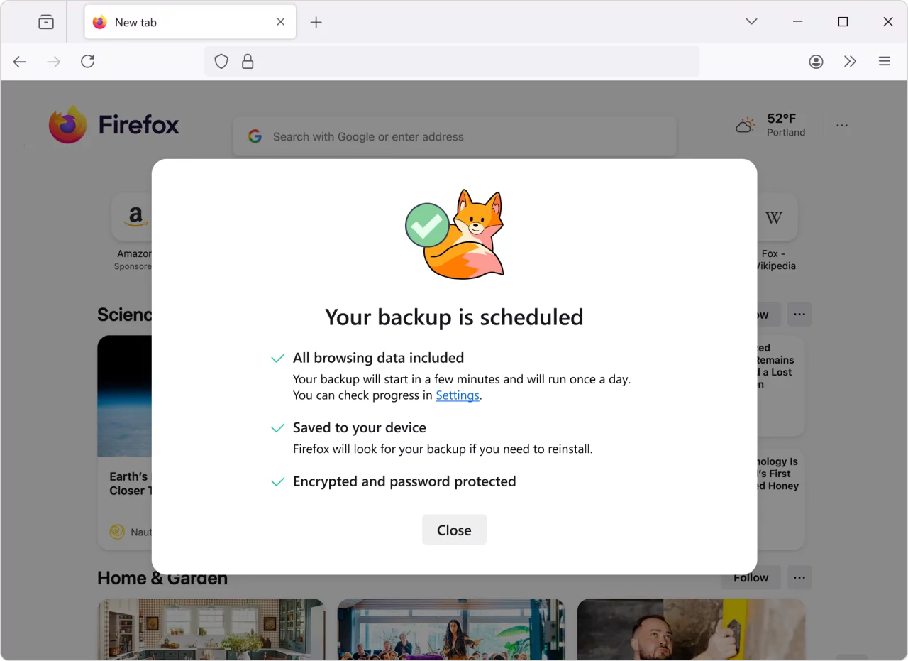- Пользователи Windows 10 теперь могут автоматически защищать свои пароли, закладки и другие данные, включив резервное копирование в Firefox. Ваши данные о работе в браузере ежедневно сохраняются на устройстве и могут быть зашифрованы паролем. Когда вы будете заново устанавливать Firefox на новом или текущем устройстве, вы сможете восстановить данные из этой резервной копии и продолжить работу с того места, где остановились. Эта функция сейчас доступна на устройствах с Windows и скоро появится на других операционных системах.